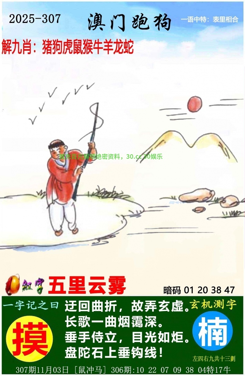 | 307期:九肖 | 马蛇牛龙鸡羊狗鼠兔 | 开:狗20 |
