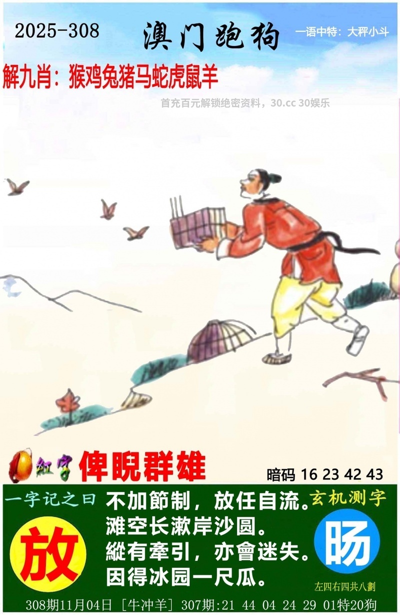 308期:挂牌《并日而食》 解释:意指因贫困而两天只能吃一天的食物,形容生活极度穷困 解料:并日。解兔龙蛇马羊猴,挂:34爆:蛇 七肖:猴蛇兔龙马羊鸡 |